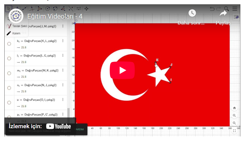 GeoGebra ile Bayrak Tasarımı Atölyesi’nde hepimiz Türk bayrağını (TC) oluşturacağız. Görev 1’de bayrağın temel şekillerini (zemin, hilal, yıldız) kendi kurulumunuzla çizeceksiniz.